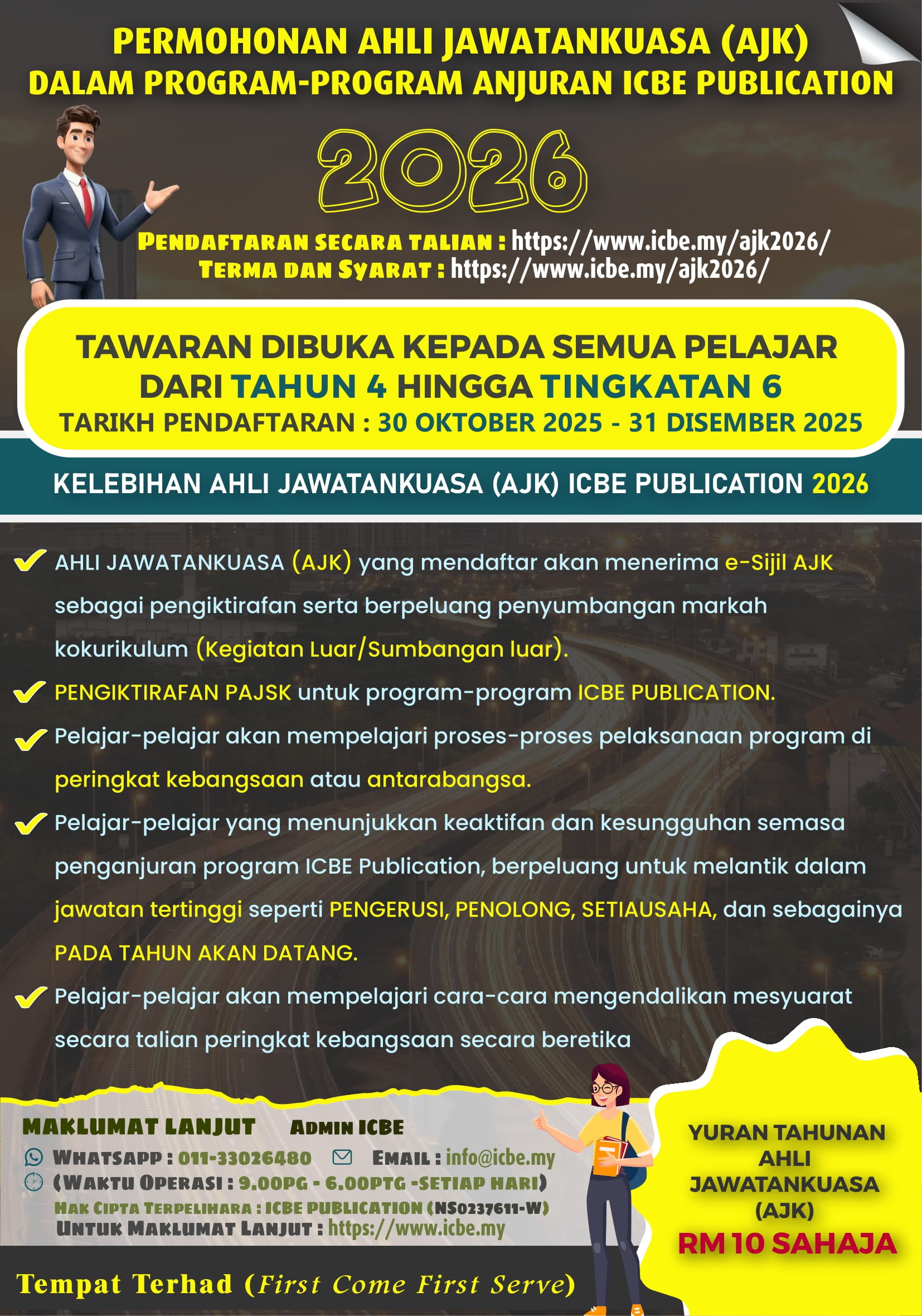 - Pelajar-pelajar yang menunjukkan keaktifan dan kesungguhan semasa penganjuran program ICBE Publication, berpeluang untuk melantik dalam jawatan tertinggi seperti PENGERUSI, PENOLONG, SETIAUSAHA, dan sebagainya PADA TAHUN AKAN DATANG.