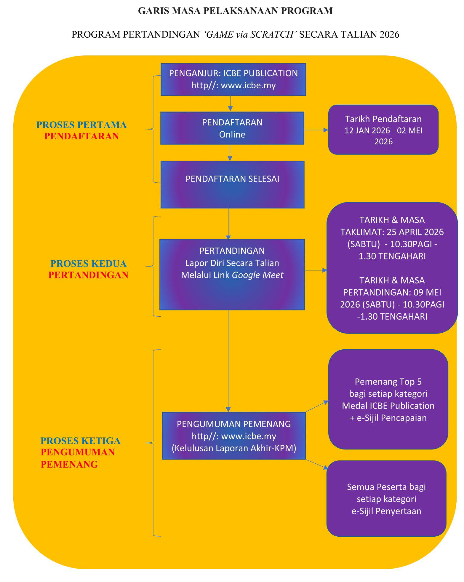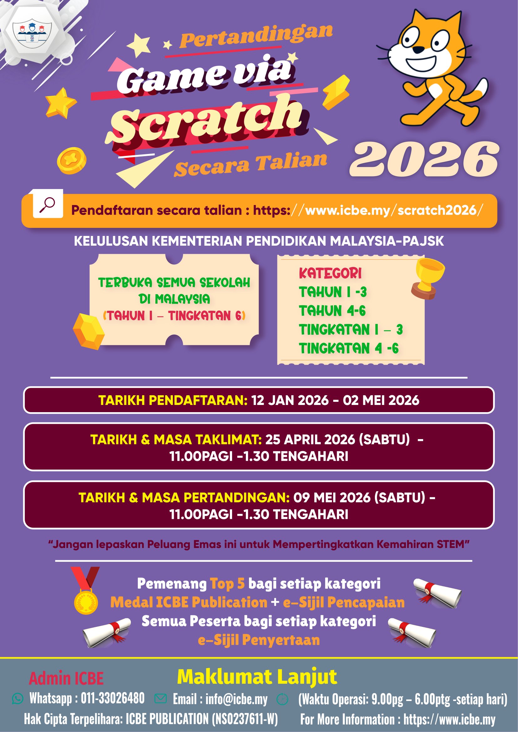 SemuaΒ Peserta WAJIB hadir TaklimatΒ Pertandingan βGame Via Scratchβ Secara Talian 2026 Secara Talian padaΒ 25 APRIL 2026 Β hari Sabtu pada pukulΒ 10.30 pagi β 1.00 tengahari dan Cikgu-cikgu ataupun ibubapa juga menggalakkan menghadirkan diri dalam taklimat ini untuk mengetahui proses-proses pertandingan.Β