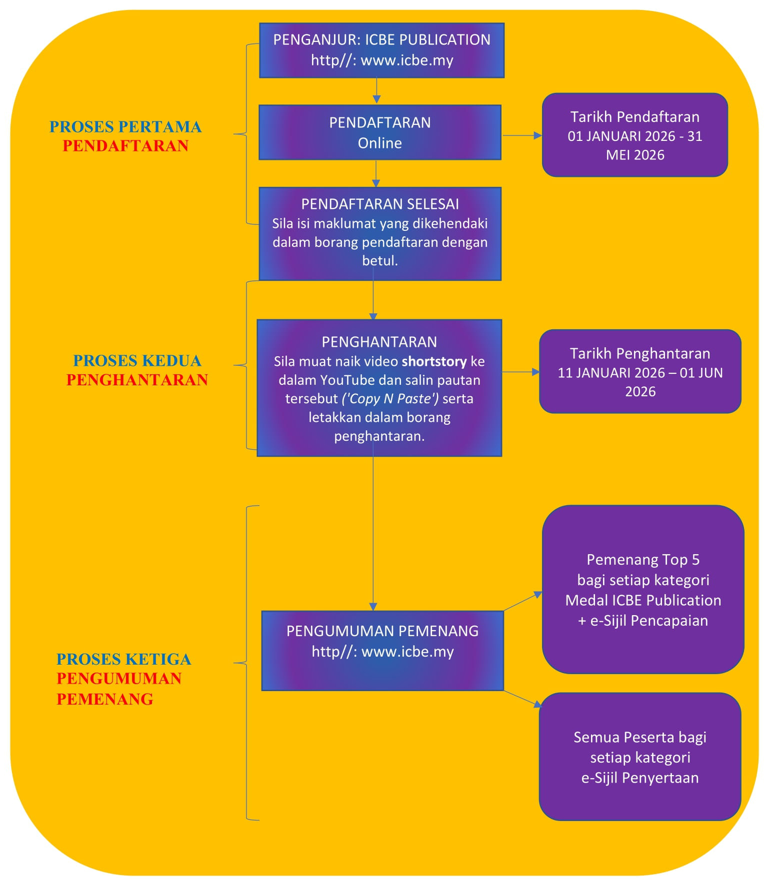 14. Surat pengiktirafan PAJSK akan dimuat naik dalam kumpulan Telegram ICBE Publication di https://t.me/icbe_conference semasa pengumuman pemenang pada minggu keempat September 2026.